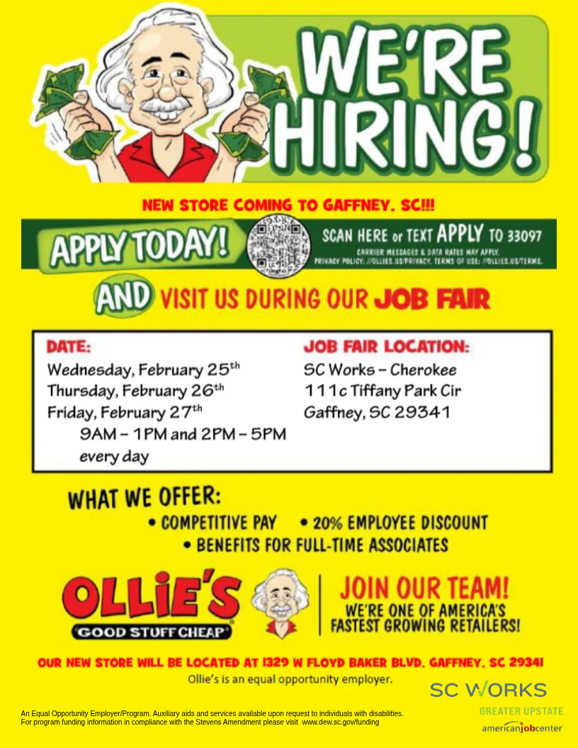 Member for 1 year 5 months Submitted by Susan Crutchfield on Tue, 02/24/2026 - 12:16 Event Category Job-Fair start date Thu, 02/26/2026 - 09:00 end date Thu, 02/26/2026 - 13:00 Popup Body 9AM-1PM & 2PM-5PM SC Works Cherokee 111 C Tiffany Park Circle Gaffney, SC 29341 flyer